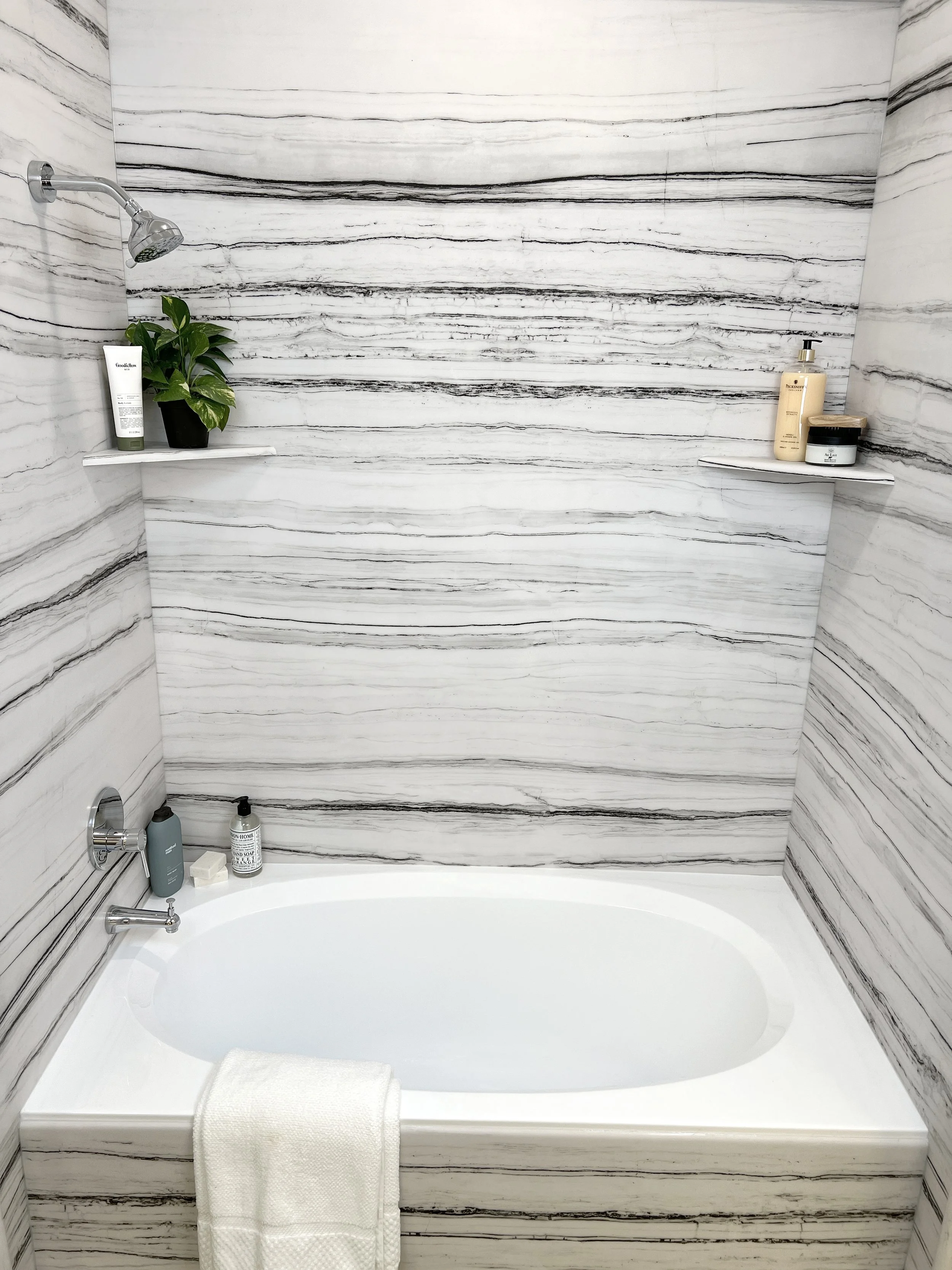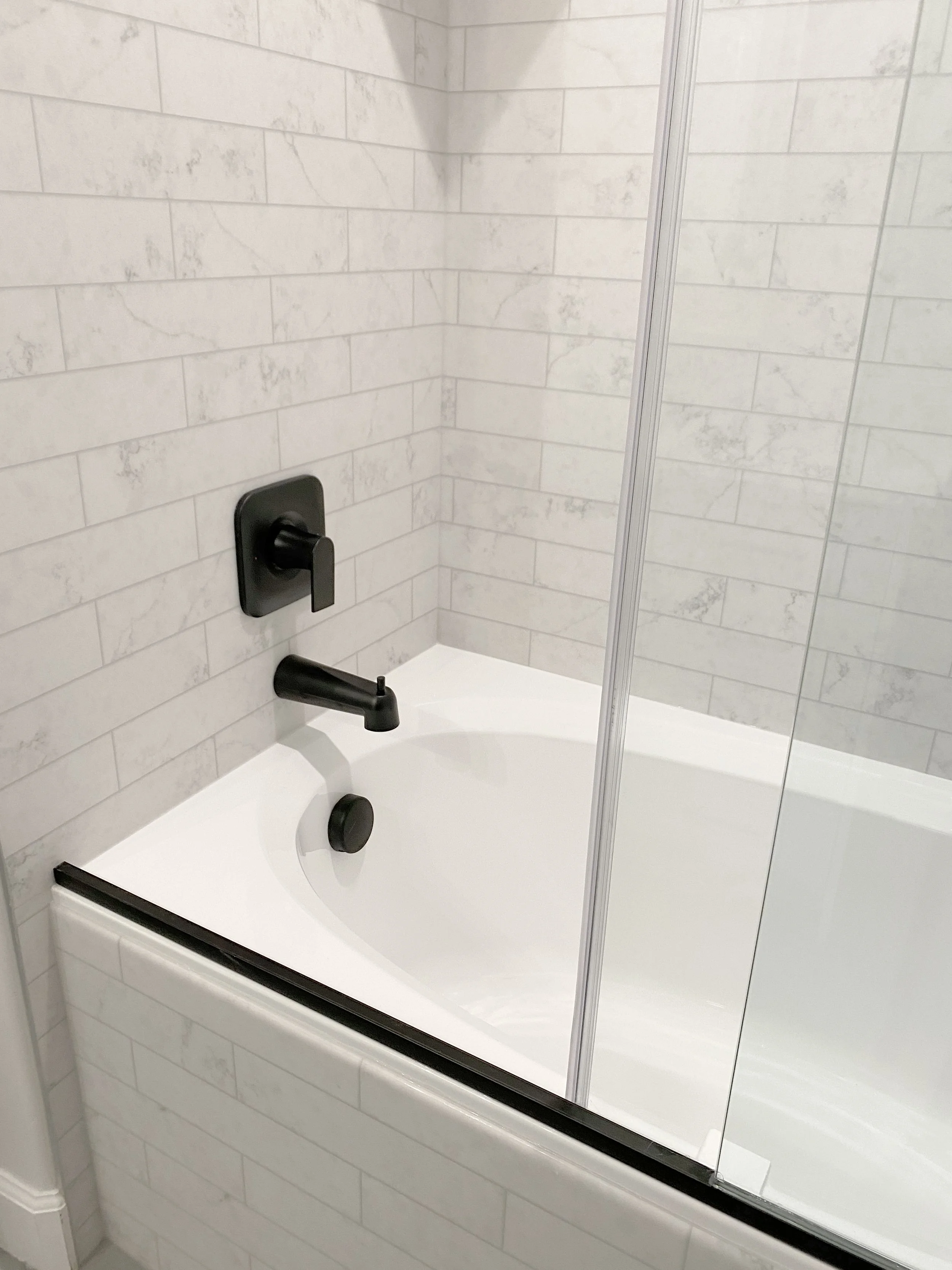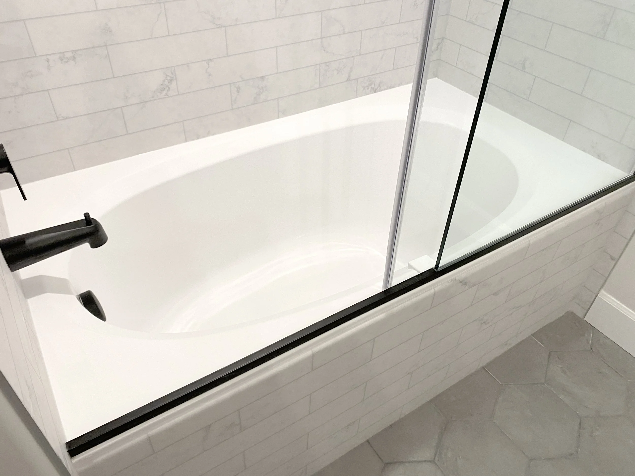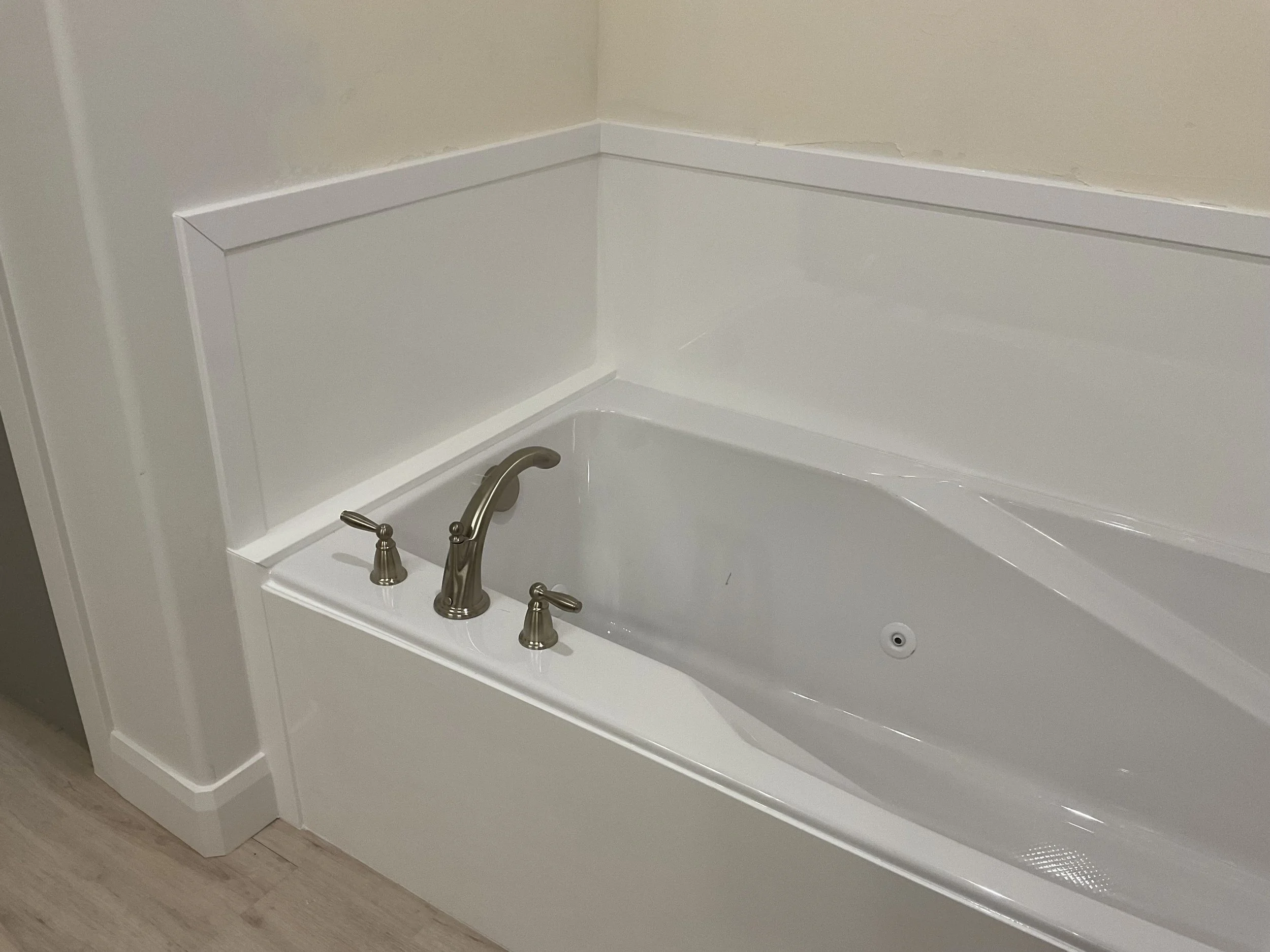 After the trim is in place, cut and install the tub panel so it sits right on top of the trim.