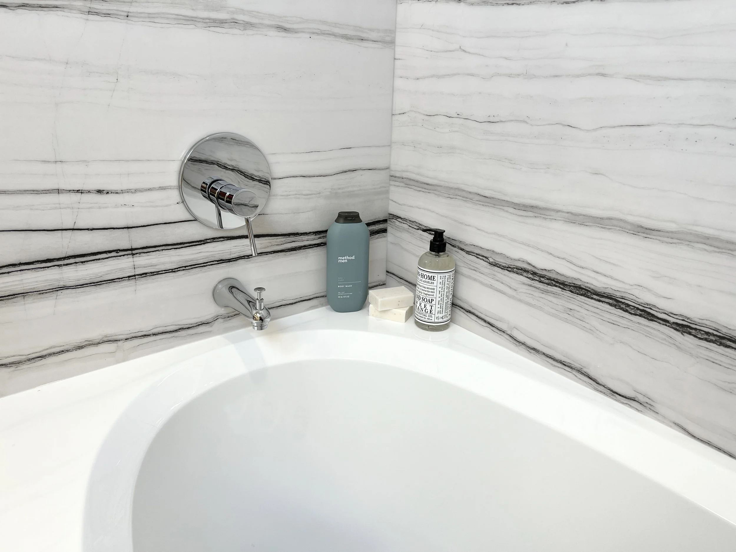 Attach a cleat to the sheetrock at the height of the tub flange. This can be a piece of wood, a marble scrap, or screws.